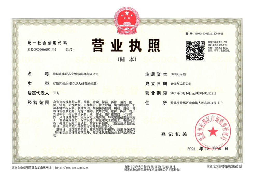 鹽城市華聯(lián)高空維修防腐有限公司始建于上世紀(jì)八十年代,系專業(yè)從事風(fēng)力發(fā)電機(jī)塔筒防腐,塔筒維護(hù),塔筒補(bǔ)漆,塔筒噴字等工程。不停產(chǎn),不搭手架,高空懸吊施工的一級高空安全資質(zhì)、一級高空防腐施工資質(zhì)、二級建筑施工資質(zhì)的高空建修、防腐工程、公司。現(xiàn)已發(fā)展集科研、設(shè)計、施工為一體的的江蘇省較大的高空建修,高空防腐施工企業(yè);公司注冊資金3008萬元,流動資金8000多萬元;擁有高修技術(shù)科研高修工程設(shè)計、高修工程施工三大技術(shù)與施工組織體系;公司擁有一流的技術(shù)施工隊伍,其中有高級職稱36 名,中級職稱126人。具備一級防腐資質(zhì)、一級安全資質(zhì)及二級建筑資質(zhì),公司下轄五個分公司和十八個辦事處,為全國數(shù)百家企業(yè)解決了若干“高、大、難”的特殊工程項(xiàng)目,填補(bǔ)了我國建筑史上的空白。